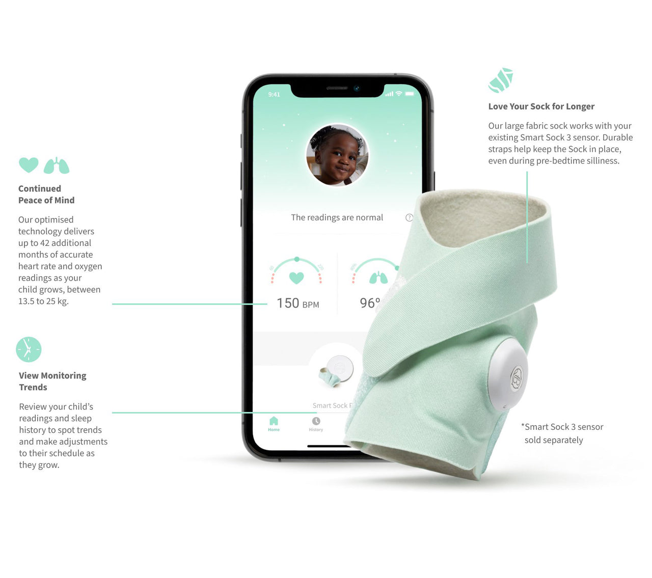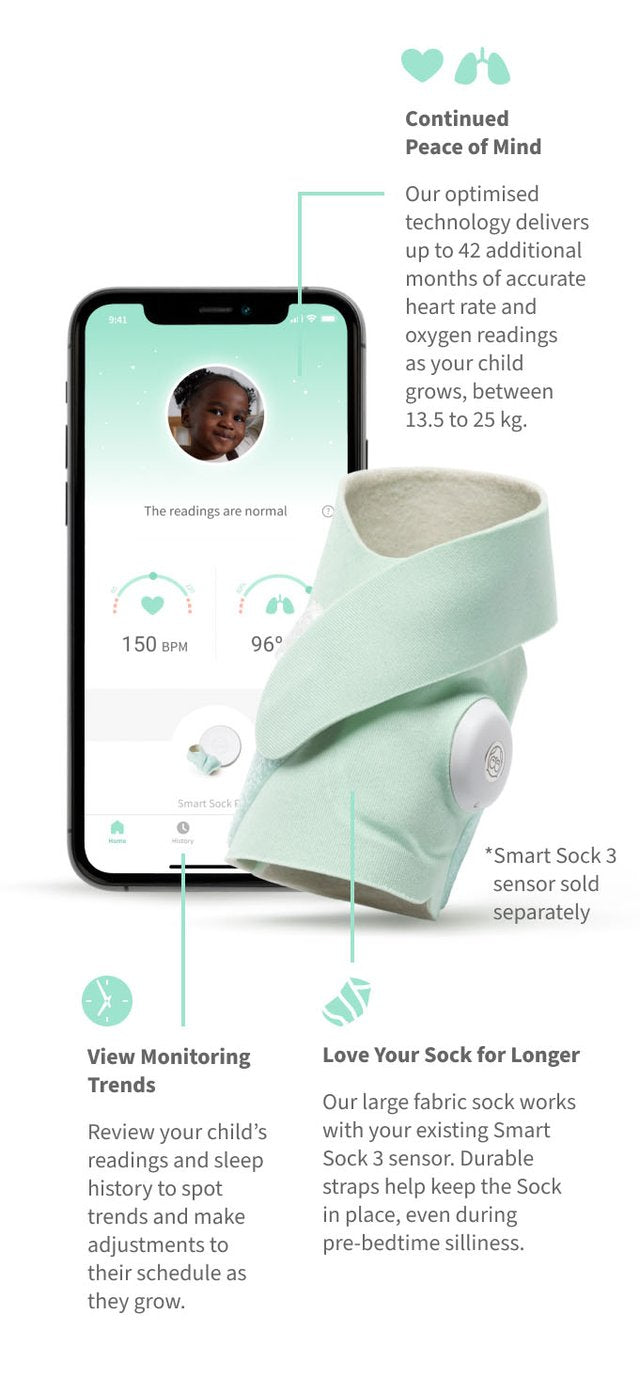 Our Extension Pack allows you to continue tracking your child’s pulse rate, oxygen level, and sleep trends up to 5 years of age. The included toddler-sized fabric sock works with your existing Sock 3 sensor, and our optimized technology continues to provide accurate readings as your child grows, between 13.5 to 25 kgs.